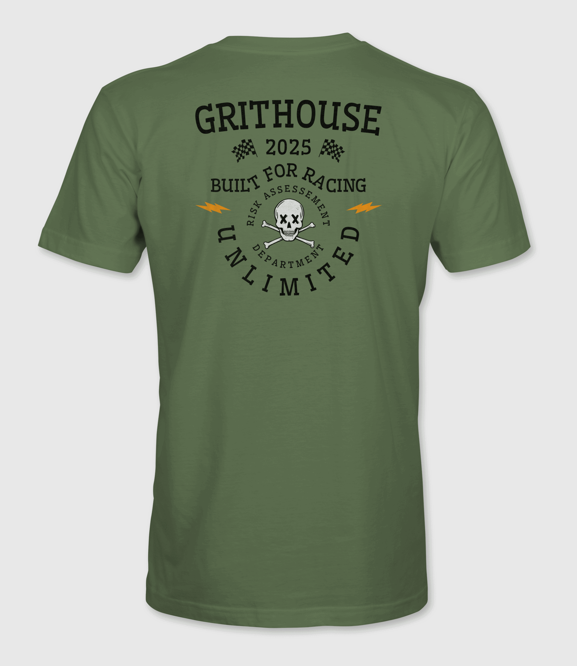 The back graphic of this t-shirt is its defining feature, showcasing a race-team badge style with unparalleled precision. The center skull-and-crossbones design boldly symbolizes the edge and excitement of competitive racing. Accented with vivid orange lightning bolts and checkered flags, the graphic reads “GRITHOUSE 2025” and “BUILT FOR RACING,” emphasizing its racing heritage. Additional phrases like “Risk Assessment Department” and “UNLIMITED” bring an assertive tone, making this t-shirt an ideal fit for race day enthusiasts looking for bold, clean style.