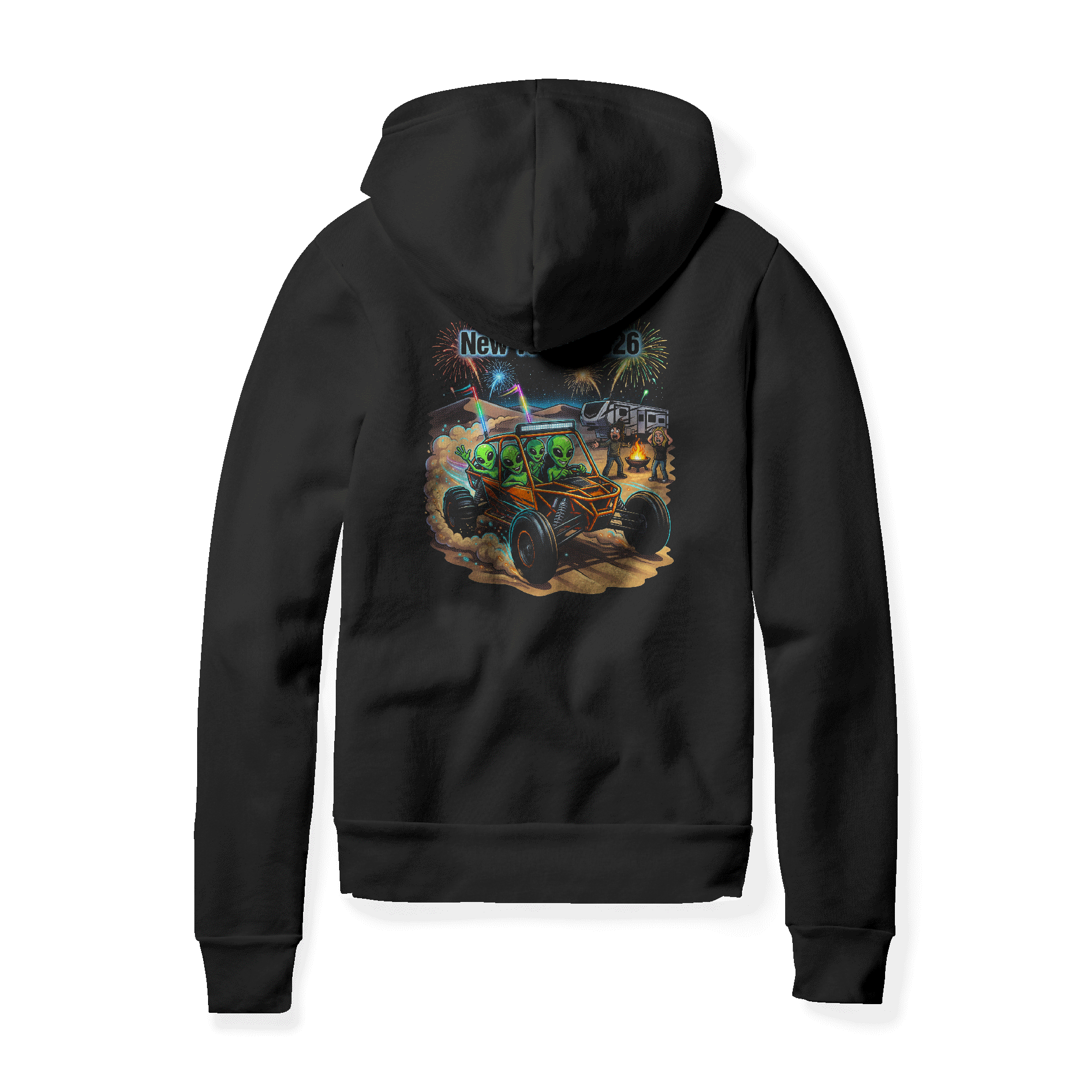The design of the hoodie features a striking image of aliens stealing a sand rail. It’s a playful twist that’s sure to make heads turn wherever you go. Whether you’re celebrating at Glamis or simply embracing your love for eccentric, eye-catching designs, this hoodie is the perfect match. Made from premium fabric, it ensures comfort throughout the day, whether you’re exploring the dunes or lounging in style.