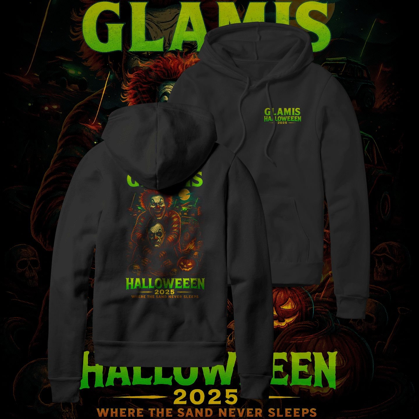 Get ready to embrace the chills and thrills of Halloween 2025 with our exclusive Glamis Halloween Hoodie! This limited-edition hoodie is designed to capture the eerie essence of Glamis, featuring a hauntingly vibrant graphic of two iconic clowns set against a fiery backdrop. The bold design is complemented by the tagline “Where the Sand Never Sleeps,” making it a standout piece for any Halloween celebration.