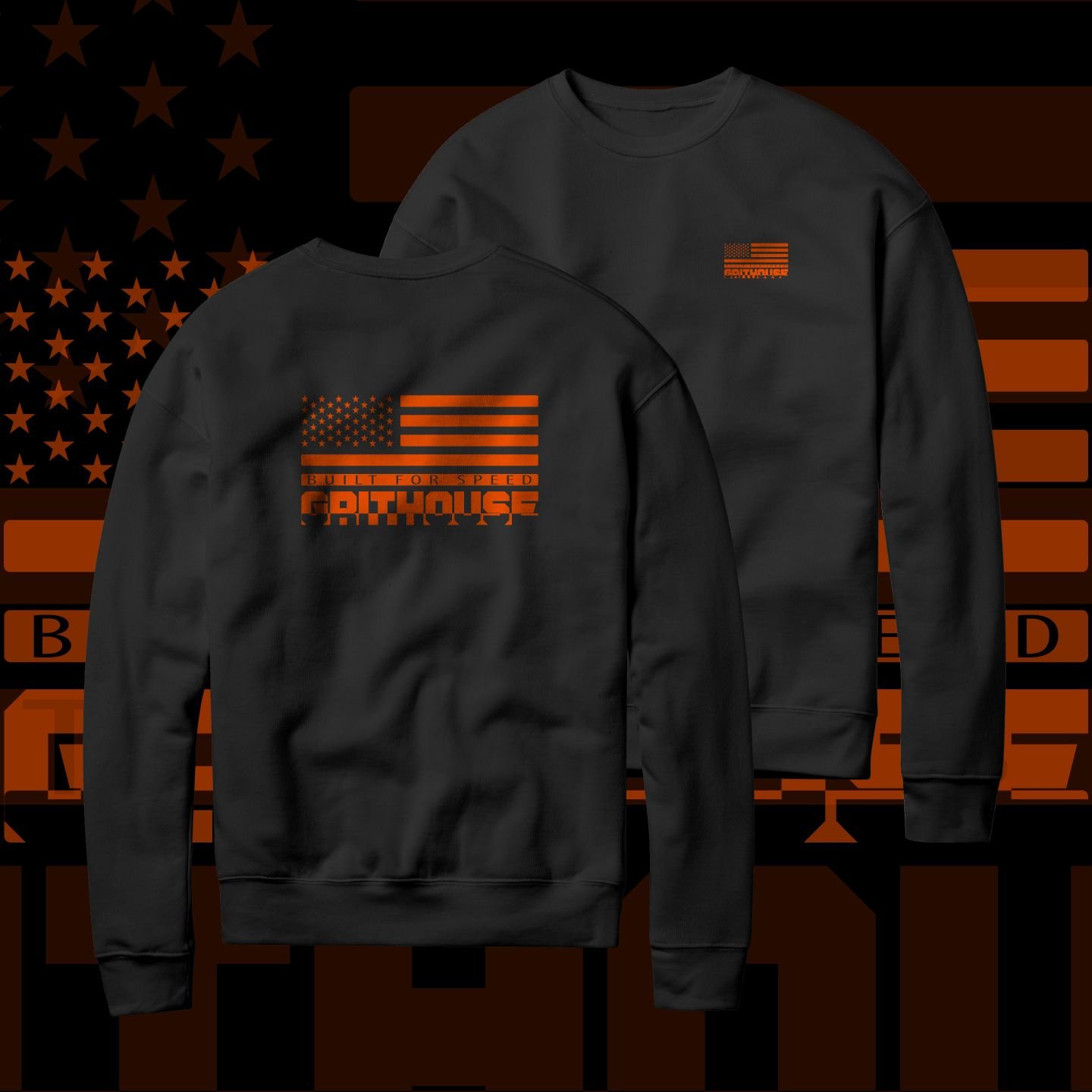 - Patriotic Speed Graphic: The back of the crewneck features a bold American flag design with the text “Built for Speed” and “GritHouse,” symbolizing both national pride and a love for high-performance action.