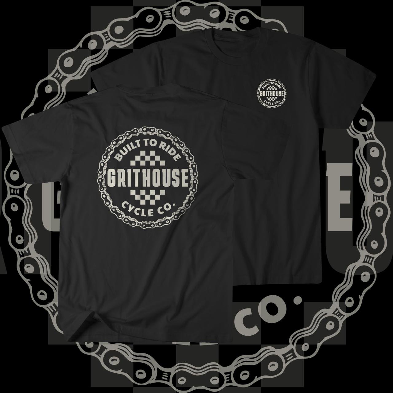 - Iconic Chain-Link Logo: The front of the t-shirt features a striking circular logo designed to resemble a , with the words “Built To Ride” and “GritHouse Cycle Co.” prominently displayed, embodying the rugged spirit of motorcycle culture.