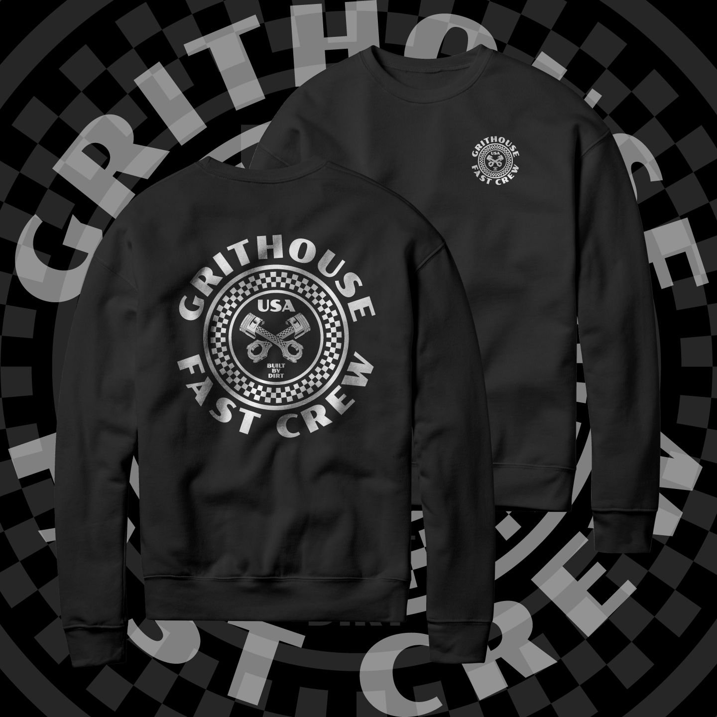 - Bold Racing Logo: The front of the crewneck showcases a striking circular logo with crossed pistons, a checkered flag pattern, and the words “GritHouse Fast Crew” and “Built By Dirt,” symbolizing speed, power, and a passion for performance.