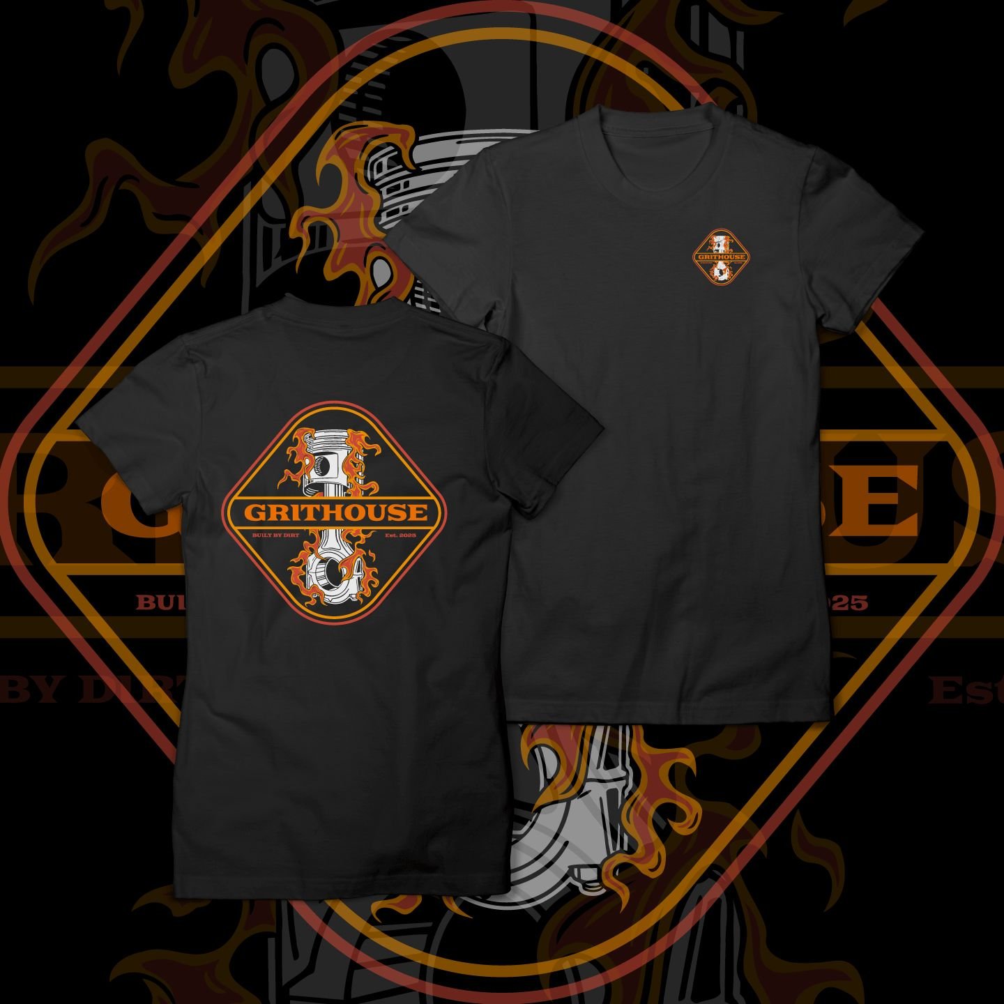 - Iconic Racing Logo: The back of the t-shirt showcases a striking circular logo with crossed pistons and a checkered flag, surrounded by the “GritHouse Fast Crew” branding. This design embodies the spirit of speed, power, and a passion for motorsports.