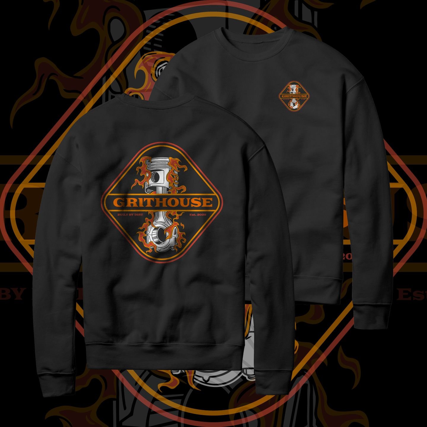 - Bold Speed Shop Logo: The front of the crewneck showcases a vibrant diamond-shaped logo with a fiery piston graphic and the words “GritHouse” and “Est. 2025,” symbolizing speed, power, and a passion for performance.