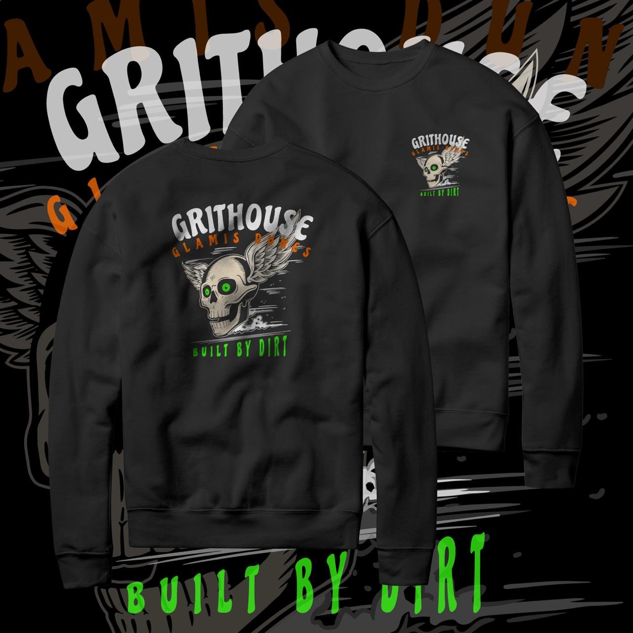 - Eye-Catching Graphic Design: The back of the crewneck showcases a striking skull with wings, symbolizing freedom and adventure, paired with the bold text “GritHouse Glamis Dunes” and the slogan “Built By Dirt.”