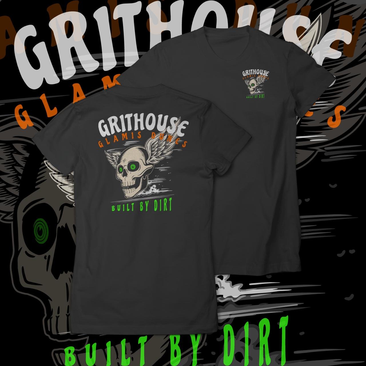 • Eye-Catching Graphic Design: The back of the t-shirt showcases a striking skull with wings, symbolizing freedom and adventure, paired with the bold text “GritHouse Glamis Dunes” and the slogan “Built By Dirt.”