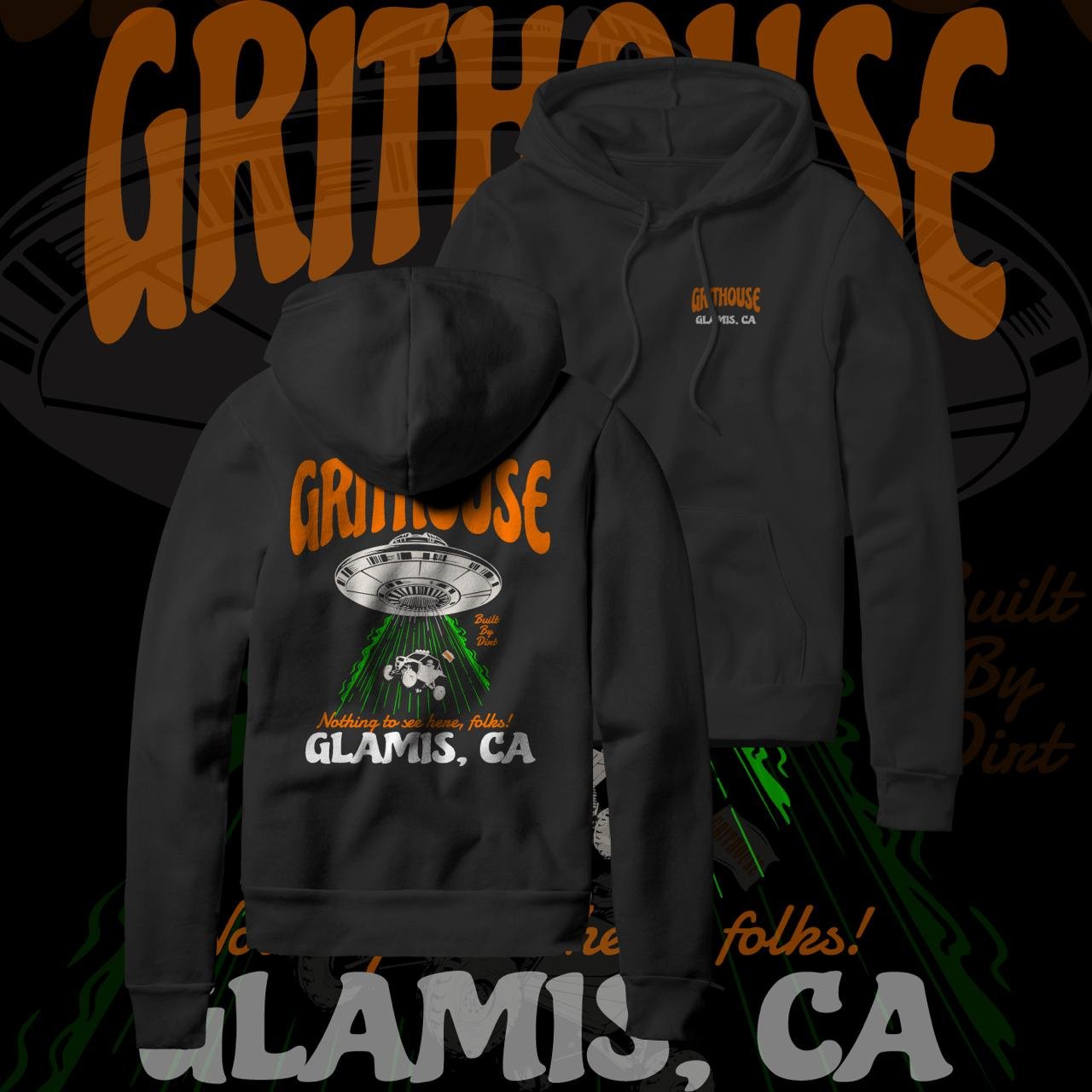 - Unique UFO Graphic: The back of the hoodie showcases a whimsical , accompanied by the text “GritHouse,” “,” and “Glamis, CA,” celebrating the legendary stories of the area.