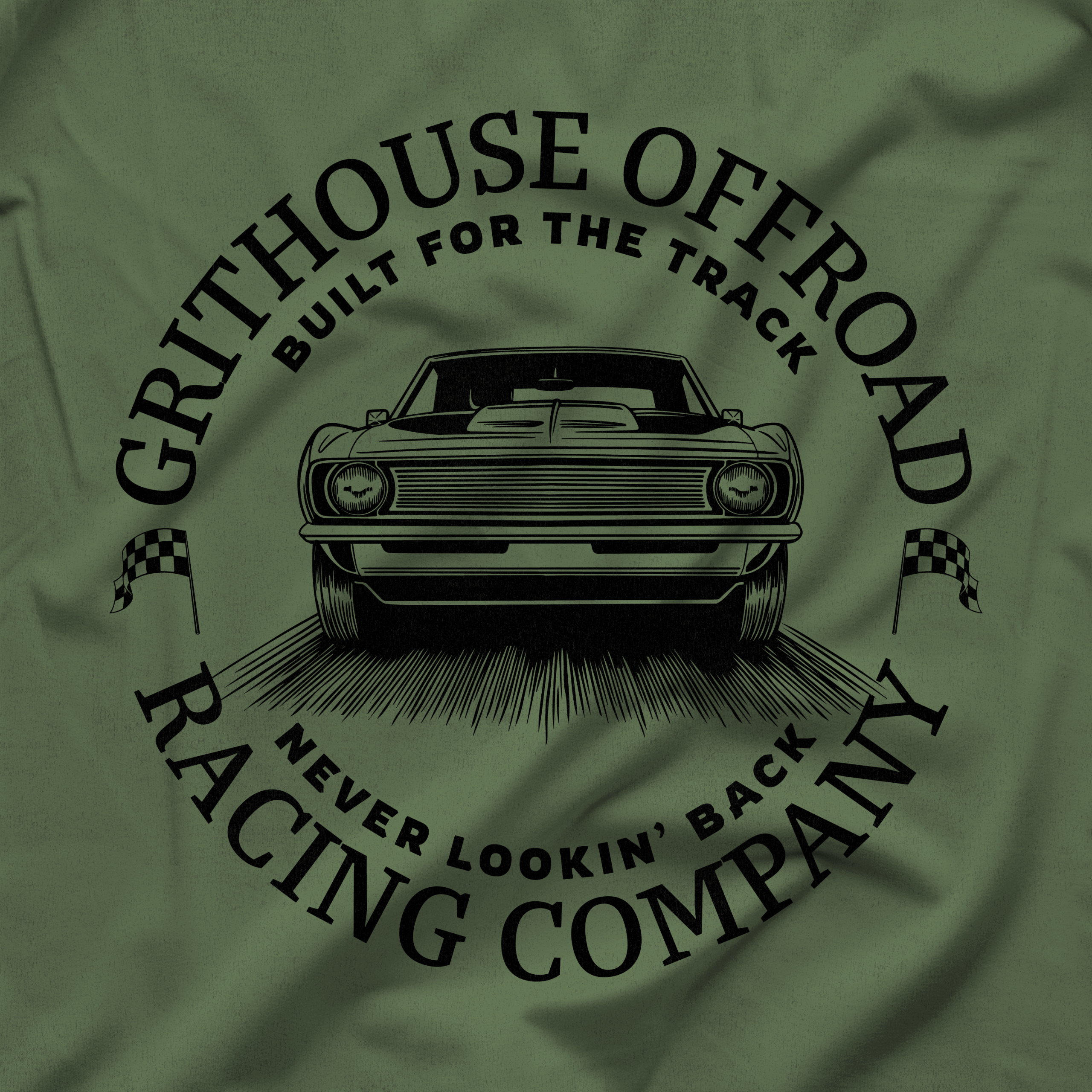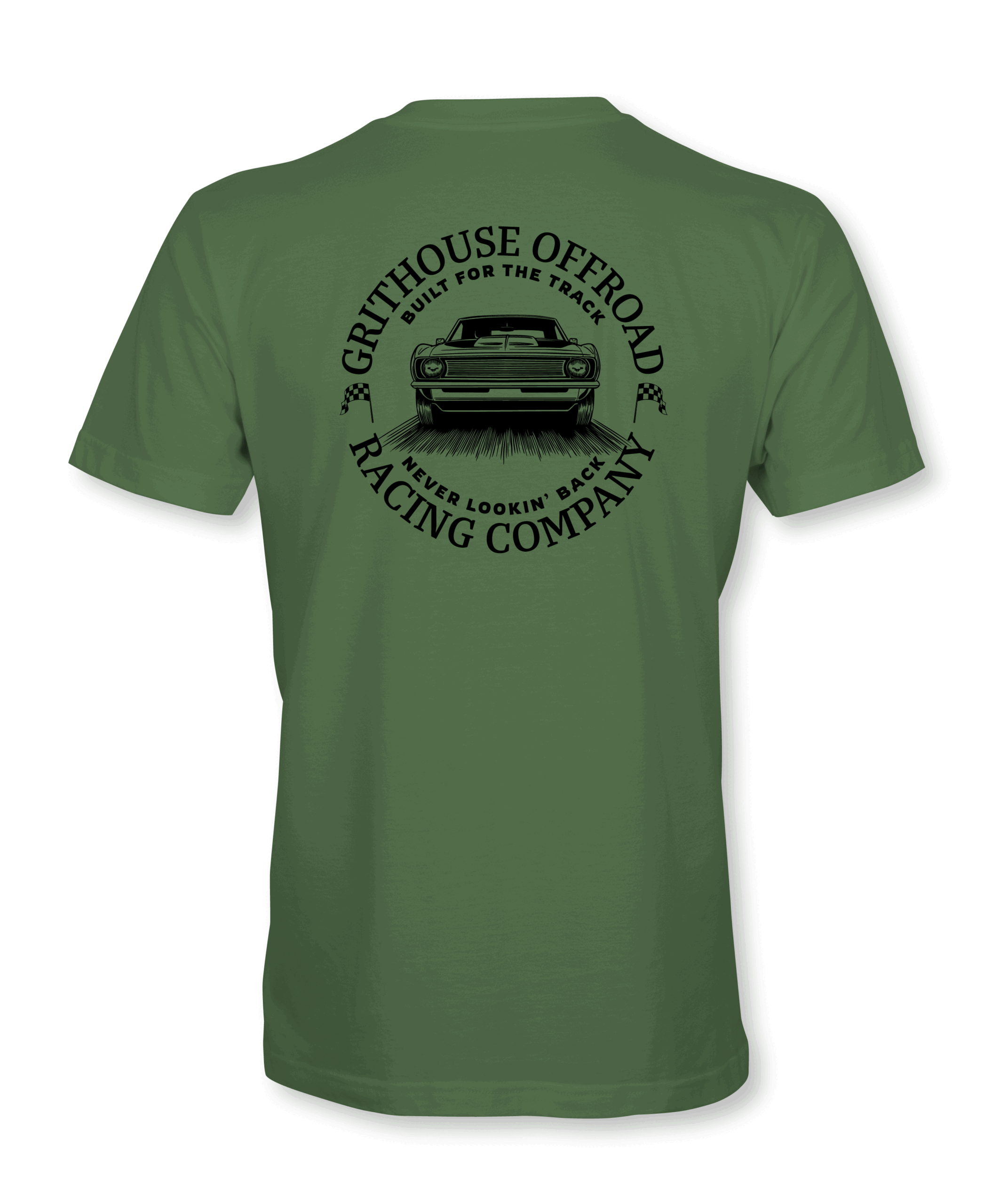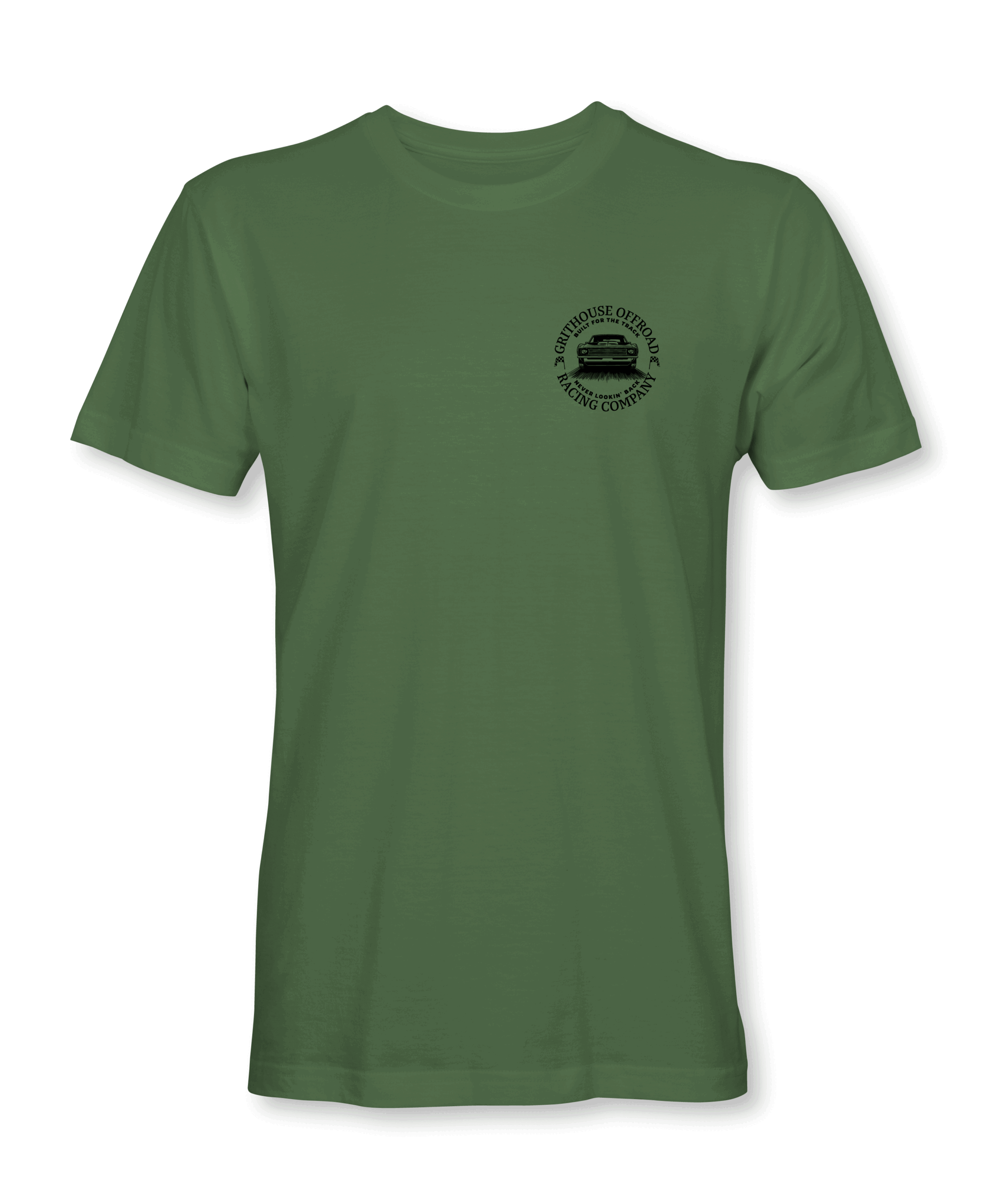 Olive Grithouse tee featuring the “Unapproved” front graphic—skull-and-crossbones with “Never Broken” detail and bold lettering for a tough, off-road-ready look.