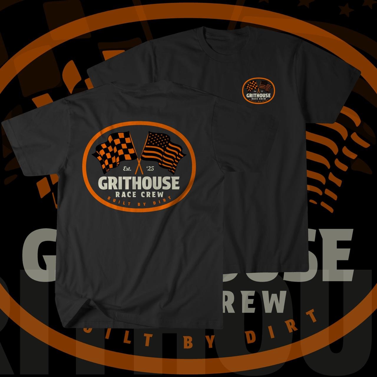- Iconic Racing Logo: The front of the t-shirt showcases a striking logo with crossed checkered flags and the American flag, accompanied by the text “GritHouse Race Crew” and “Est. 1925,” symbolizing heritage, speed, and patriotism.