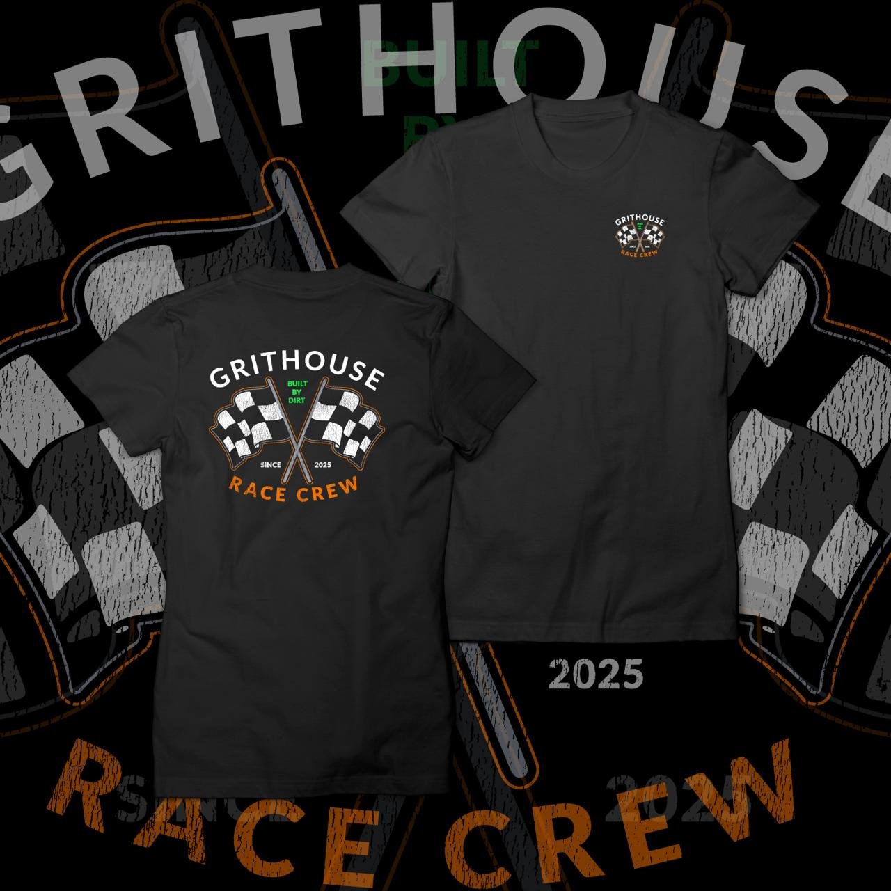 • Racing-Inspired Design: The back of the t-shirt showcases crossed checkered flags with the text “GritHouse Race Crew” and “Since 2025,” symbolizing victory, speed, and the racing legacy.