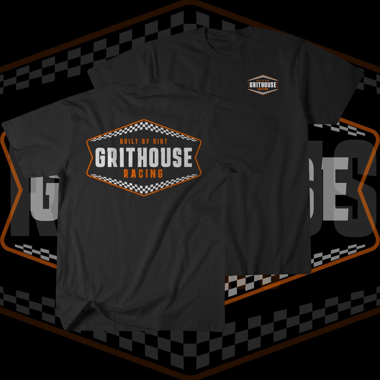 • Bold Racing Logo: The front of the t-shirt showcases a striking shield-shaped logo with a checkered flag pattern and the words “GritHouse Racing” and “Built By Dirt,” symbolizing speed, power, and a passion for performance.