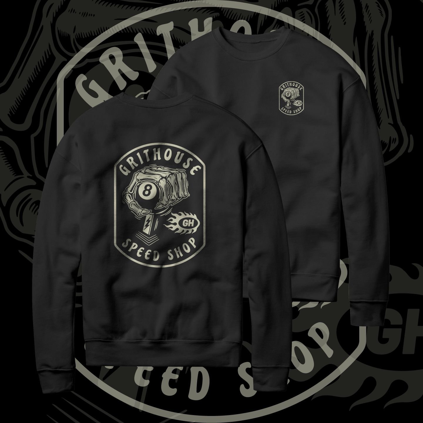 - Unique Lucky 8 Ball & Piston Logo: The front of the crewneck features a bold shield-shaped logo with an 8-ball and piston graphic, accompanied by flames and the words “GritHouse Speed Shop,” blending luck and speed into one iconic design.