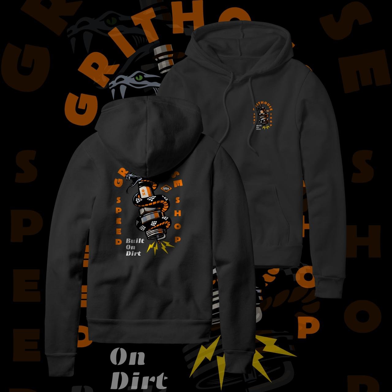 - Bold Speed Shop Graphic: The back of the hoodie showcases a striking design of a snake coiled around a piston, with the words “GritHouse Speed Shop” and “Built On Dirt,” symbolizing speed, power, and a passion for performance.