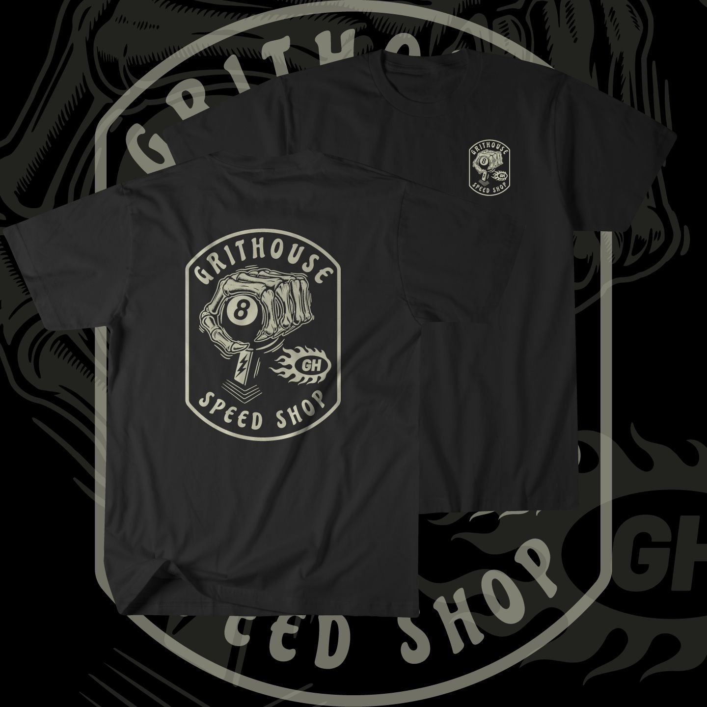 - Unique Lucky 8 Ball & Piston Logo: The front of the t-shirt features a bold shield-shaped logo with an 8-ball and piston graphic, accompanied by flames and the words “GritHouse Speed Shop,” blending luck and speed into one iconic design.