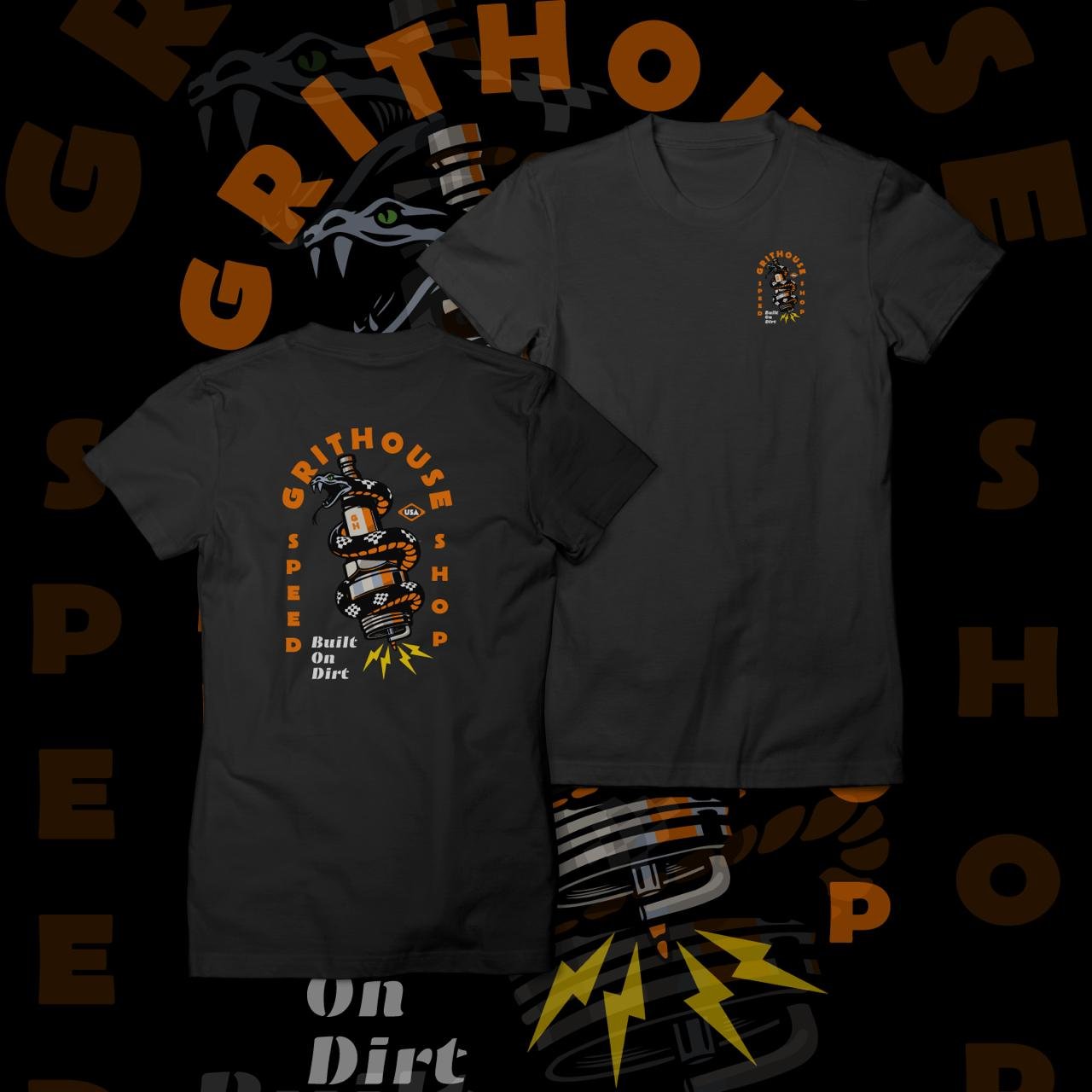 - Bold Speed Shop Graphic: The back of the t-shirt showcases a striking design of a snake coiled around an exhaust pipe, with the words “GritHouse Speed Shop” and “Built On Dirt,” symbolizing speed, power, and a love for high-performance vehicles.