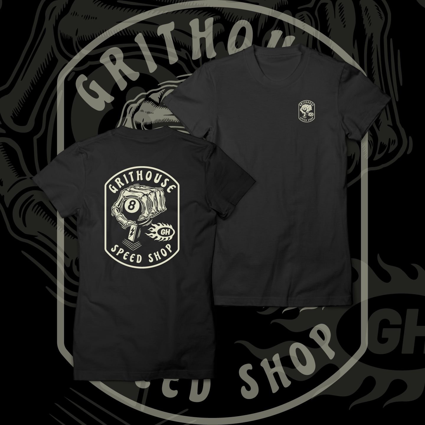• Unique Lucky 8 Ball & Piston Logo: The back of the t-shirt features a bold shield-shaped logo with an 8-ball and piston graphic, accompanied by flames and the words “GritHouse Speed Shop,” blending luck and speed into one iconic design.