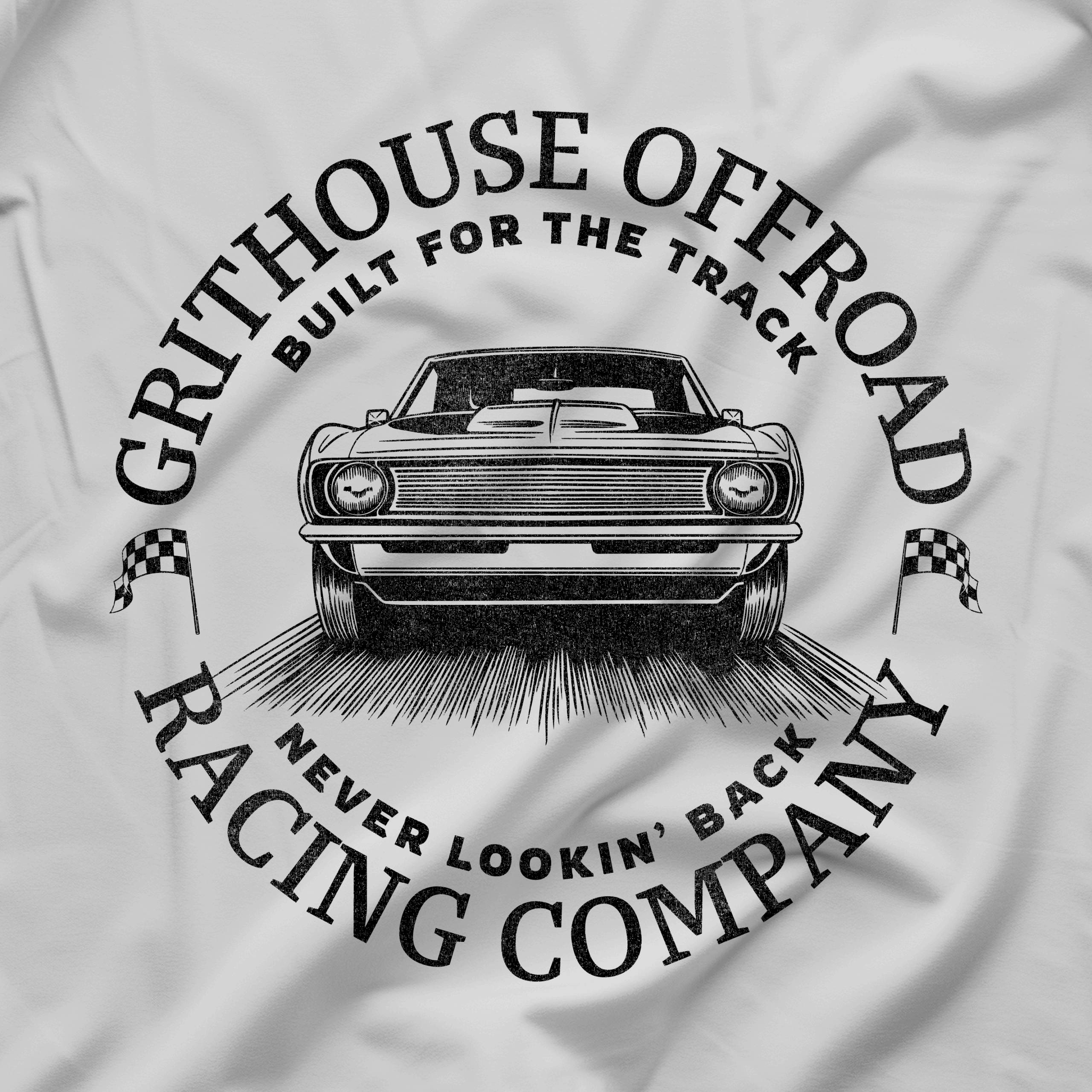 Step into the world of Grithouse Offroad with this stunning white short-sleeve t-shirt, featuring a captivating and bold graphic design that’s guaranteed to turn heads. The classic motorsport-inspired artwork prominently displays the Grithouse branding in clean black ink, with elements like a vintage muscle car, checkered race flags, and an empowering slogan — “NEVER LOOKIN’ BACK.” Express your passion for off-road adventures, track days, and garage nights with a shirt built for style and storytelling.
