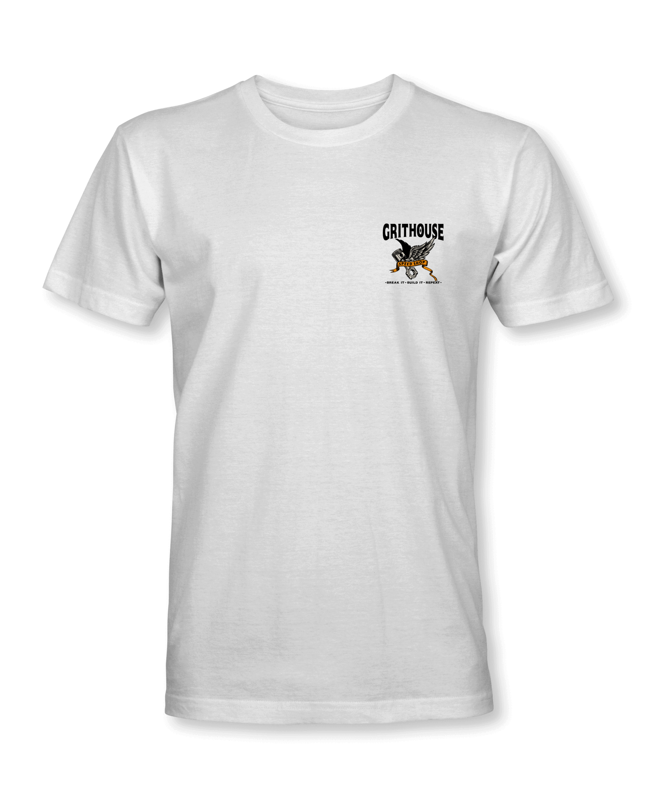 The graphic features clean black linework, complemented by vibrant orange accents for a bold and classic look. At the top, you’ll find the iconic “GRITHOUSE” logo proudly displayed, followed by a central winged piston illustration that symbolizes speed, strength, and craftsmanship. Adding to the captivating design, an orange ribbon showcases the message “SPEED SHOP” in stylized lettering, while the phrase “BREAK IT • BUILD IT • REPEAT” humorously sums up the commitment to the relentless pursuit of perfection.